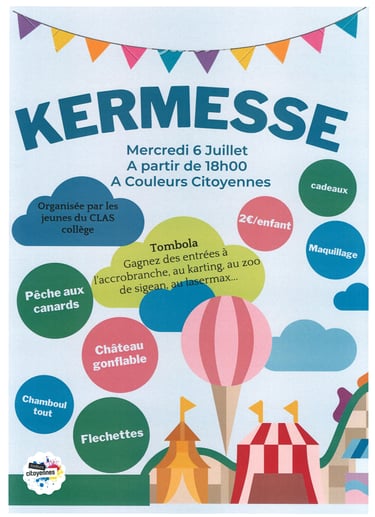 L'été est là! Alors nous organisons une journée pour célébrer la fin d'année. Les collégiens tiendront des stands de pêche au canard, chamboule tout, jeu du toucher, il y aura un château gonflable, un stand maquillage: ca leur permettra de trouver des financements pour leurs projets!