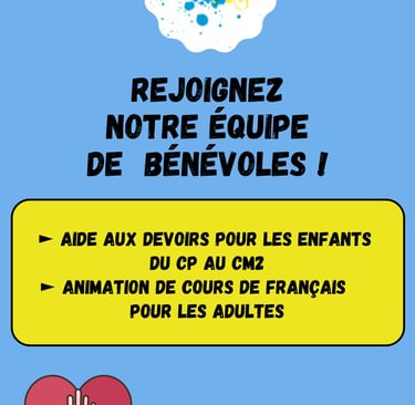 Nous avons besoin de vous ! En tant que communauté, nous visons à soutenir les jeunes dans leur parcours éducatif et à promouvoir l'apprentissage de la langue française. Pour y parvenir, nous lançons un appel à bénévoles pour aider dans les devoirs et animer des ateliers de français pour adultes. Rejoignez-nous et faites une différence dans la vie des enfants et des adultes.