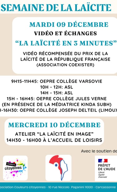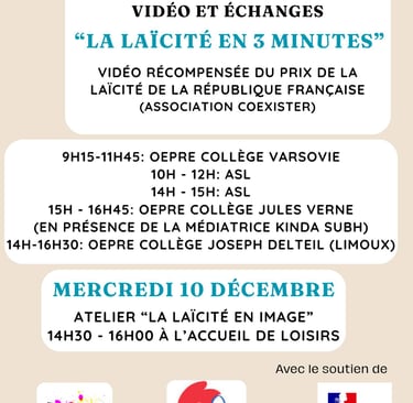 On a aussi célébré la laïcité avec une semaine spéciale du 8 au 12 décembre, là aussi avec des ateliers pour adultes dédiés (ASL et OEPRE), et aussi pour les enfants avec l'accueil de loisirs. Notre médiatrice Kinda Subh, spécialement formée "Valeurs de la République et Laïcité", est intervenue dans les groupes pour présenter ce truc commun.